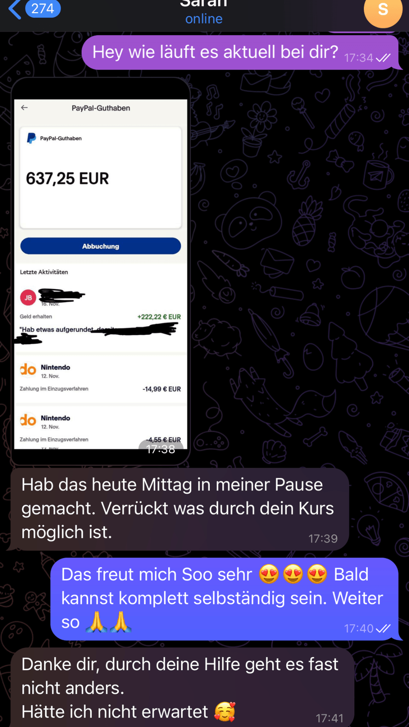 „Ich hätte nie gedacht, dass ich mit etwas so Einfachem wie getragener Unterwäsche so viel verdienen kann – und das in meiner Mittagspause! Nach dem Coaching wusste ich genau, wie ich vorgehen muss, welche Plattformen funktionieren und worauf Käufer wirklich Wert legen. Heute habe ich in nur 45 Minuten 637,25 € gemacht. Ich bin sprachlos – und mega motiviert, weiterzumachen!“