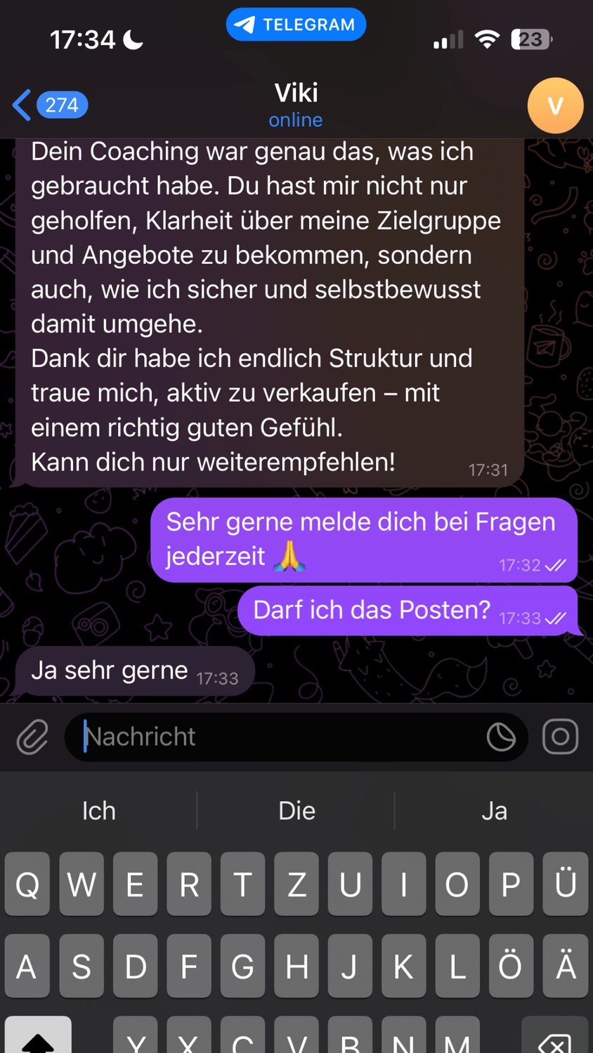 „Früher war ich nach meinem Nebenjob als Putzfrau oft einfach nur fertig. Jetzt, dank der klaren Strategie und Struktur aus dem Coaching, habe ich mir ein stabiles Einkommen aufgebaut – mit treuen Stammkunden, die regelmäßig kaufen. Ich konnte meinen Nebenjob kündigen und habe endlich mehr Zeit für meine kleine Tochter. Das Coaching hat mein Leben verändert.“