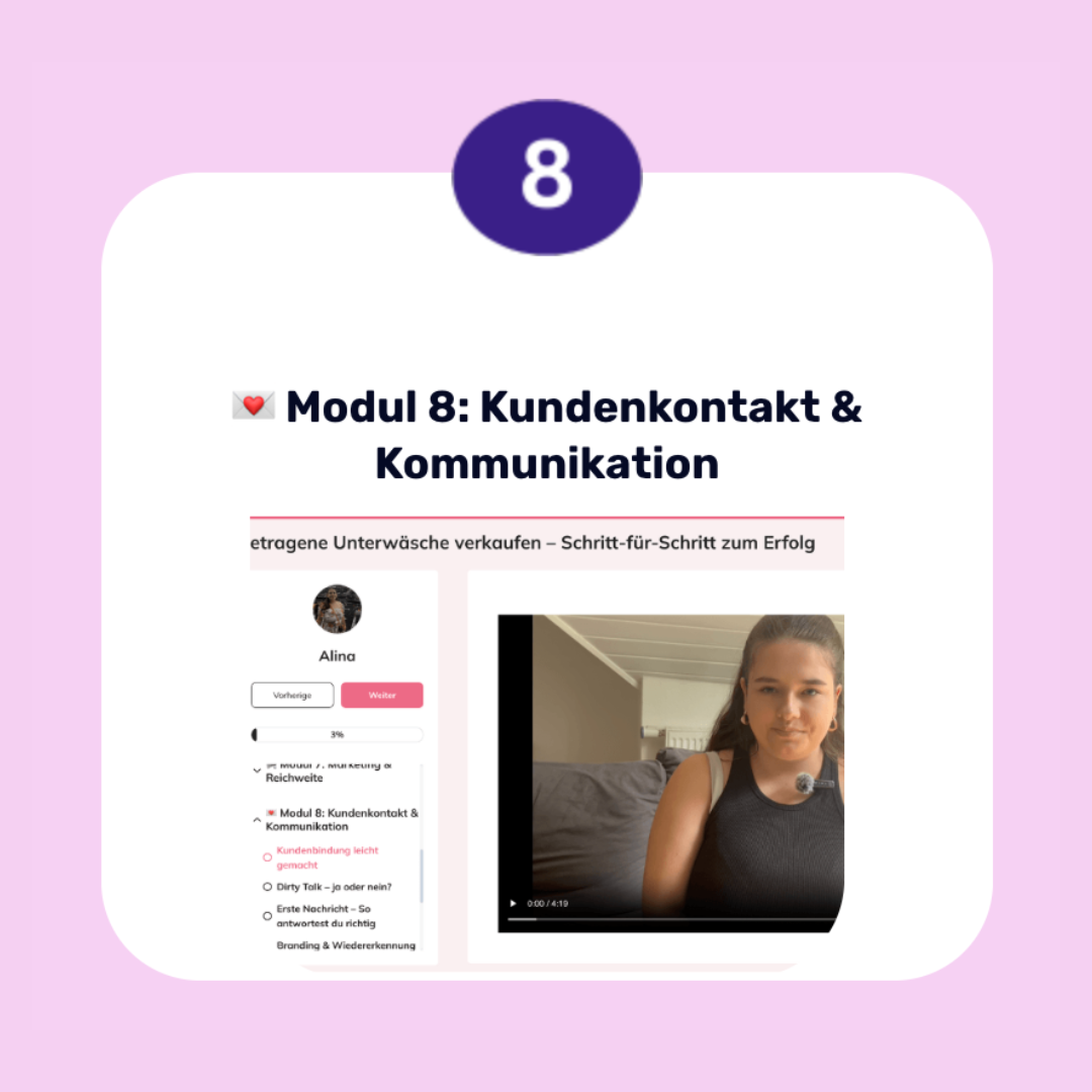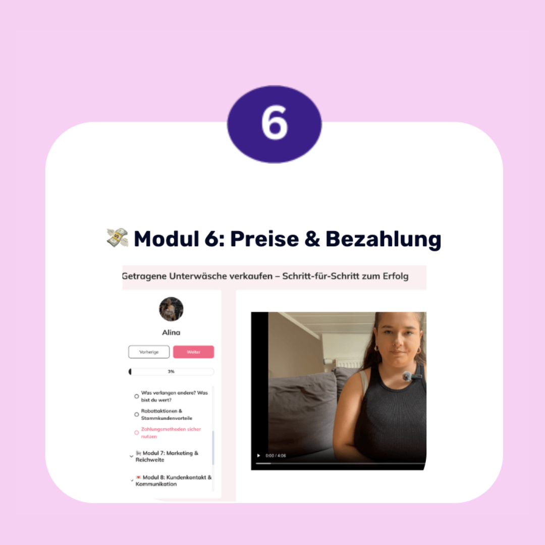 Der Kurs ist ideal für Anfängerinnen, die noch keine Erfahrung haben, aber auch für Frauen, die bereits aktiv sind und ihre Verkaufszahlen verbessern möchten. Wenn du diskret und flexibel nebenbei Geld verdienen willst, findest du hier genau das richtige Wissen dafür.