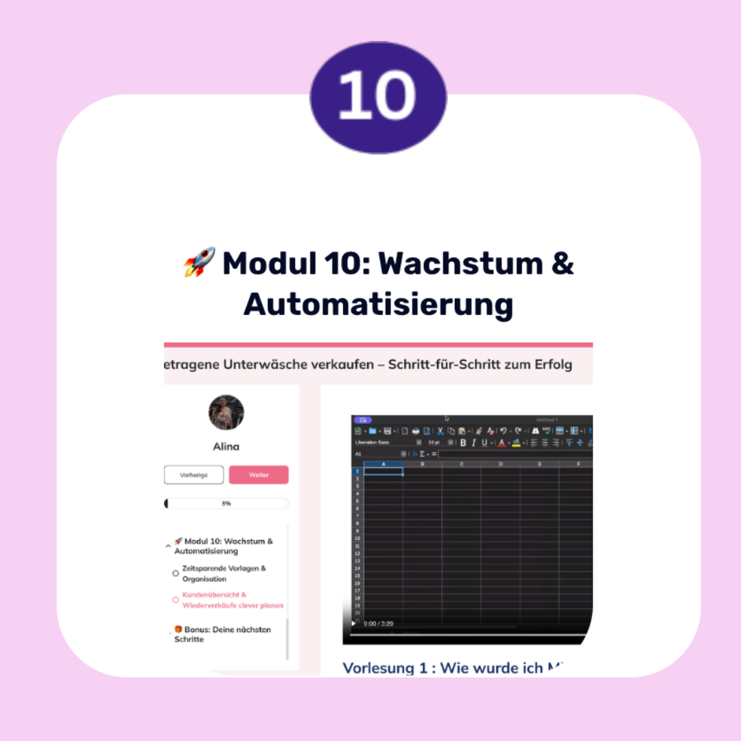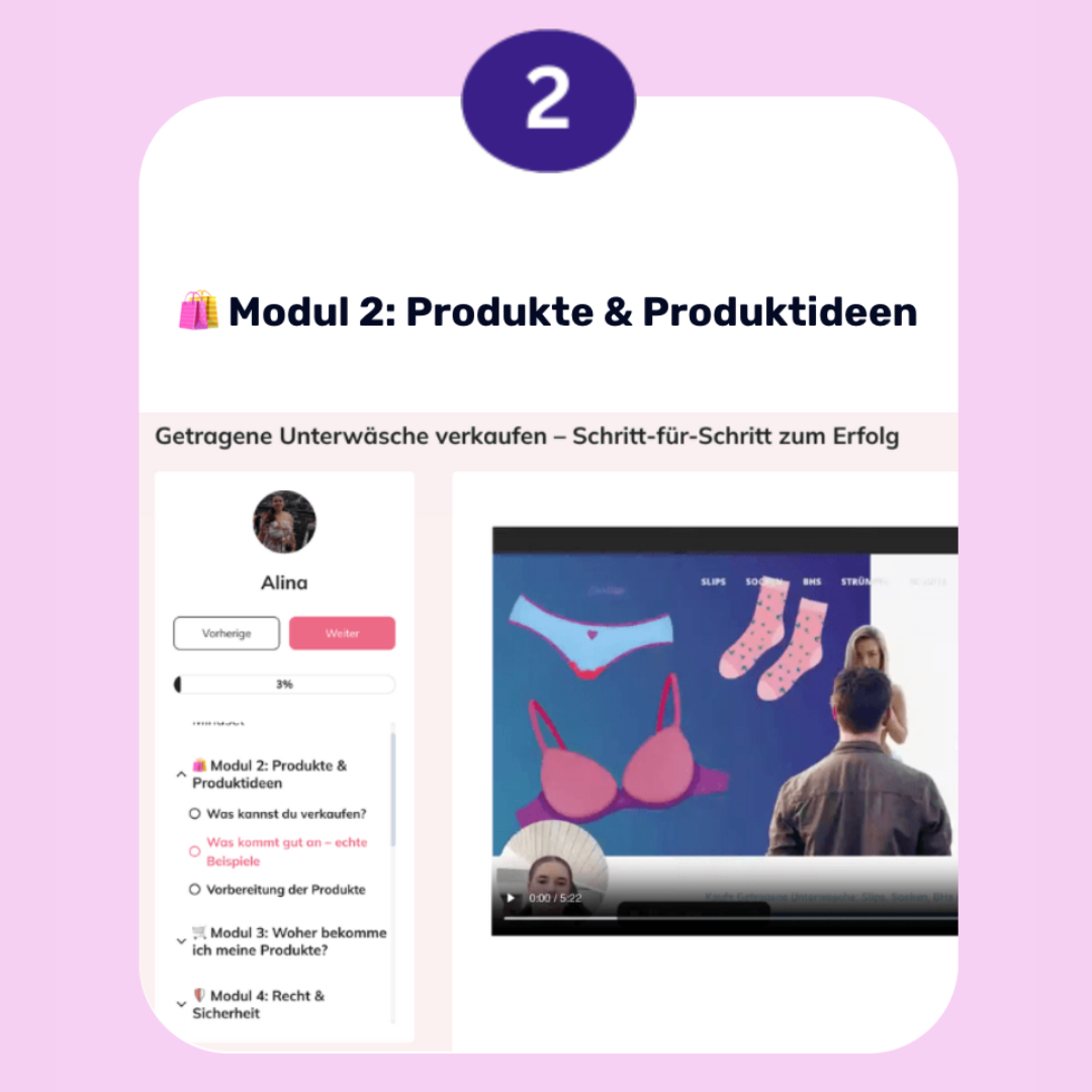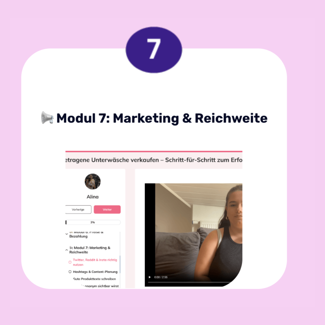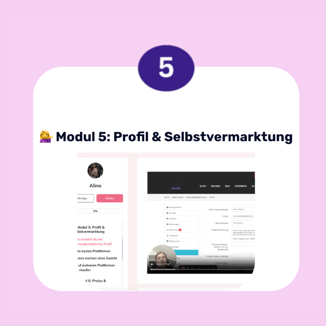 Im Kurs zeigen wir dir die effektivsten Plattformen für den Verkauf getragener Unterwäsche. Du erfährst, welche Vor- und Nachteile jede Plattform hat und wie du dich dort optimal präsentierst, um sichtbar und erfolgreich zu werden – ohne in typische Anfängerfallen zu tappen.
